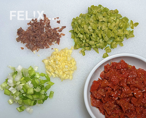 Oliven, weisse Teile der Frühlingszwiebelchen (Grün für den Taboulé beiseitelegen) und Knoblauch fein hacken.