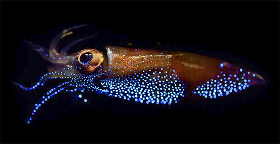 Der Kalmar geht dafür eine Lebensgemeinschaft mit biolumineszierenden Bakterien ein. Nachts leuchtet er also von innen – und wird so für Feinde, die sich im tieferen Gewässer von unten her nähern, gegen die helle Wasseroberfläche unsichtbar.