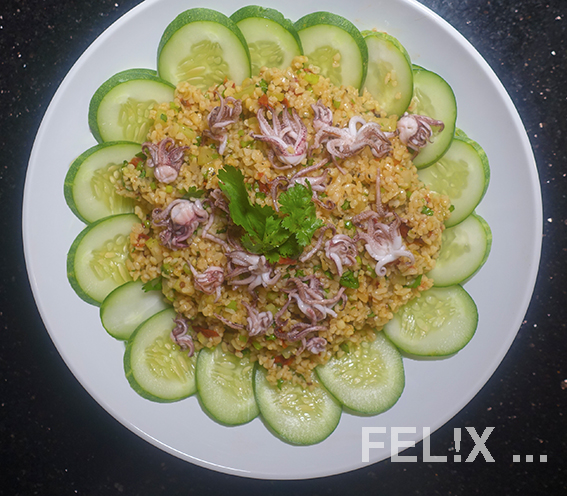 Taboulé mit ein paar Gurkenscheiben anrichten, die gebratenen Fangarme darübergeben und die gefüllten Kalmare dazu servieren.