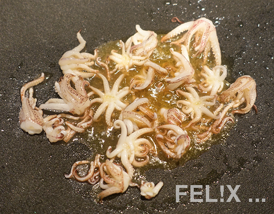 2Die Tentakel (vorbereitete Fangarme) braten, herausheben, beiseitestellen.