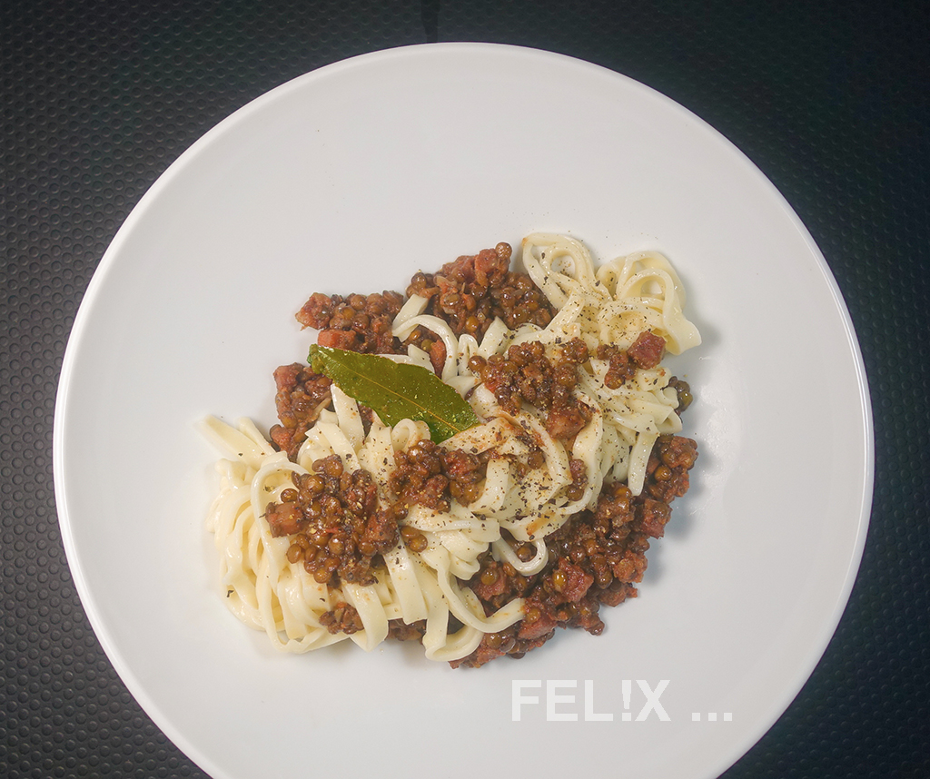 • Die Linsen in Tomatensauce schmecken köstlich. Anstelle der doch sehr aufwändigen Nudel-Herstellung könnten wohl auch selbstgemachte oder gekaufte Tagliatelle verwendet werden.