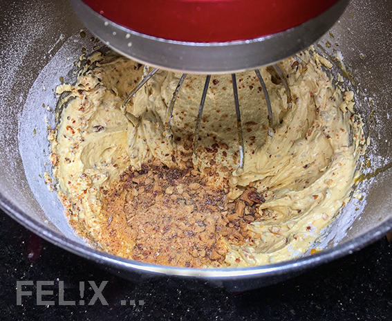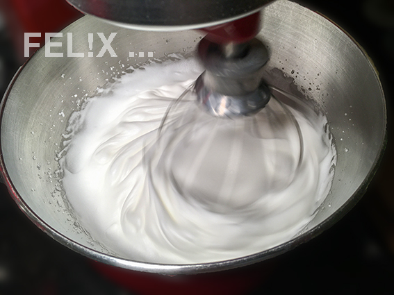Eiweiss unter die Masse melieren [FEL!X: Flachrührer mit Puls-Funktion, dann dänischer Schneebesen].