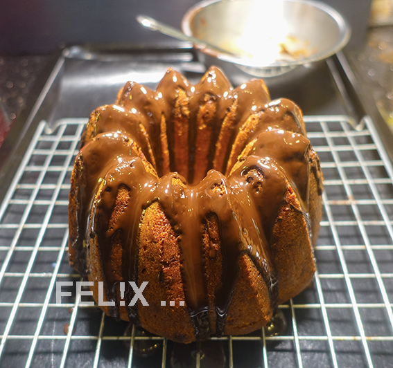 Gugelhopf daraufsetzen, Glasur über den Kuchen giessen, sie soll nicht flächendeckend sein.