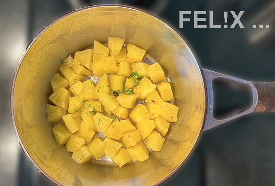 Ein Ananas-Hähnchen-Curry, Senf, Sorbet oder einen Ananas-Salat?