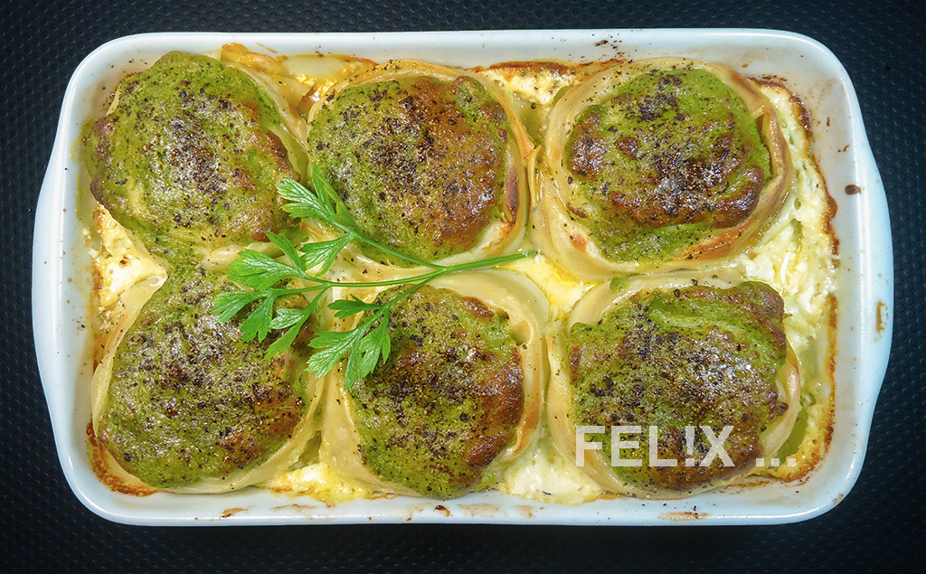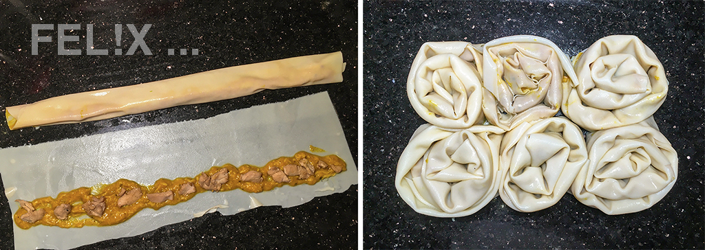 Die Füllung besteht aus Kürbispüree und Geflügelbrust, der aufgerollte und zu Schnecken geformte Pasta-Teig erhält ein Topping aus Cashewkernen und Petersilie.