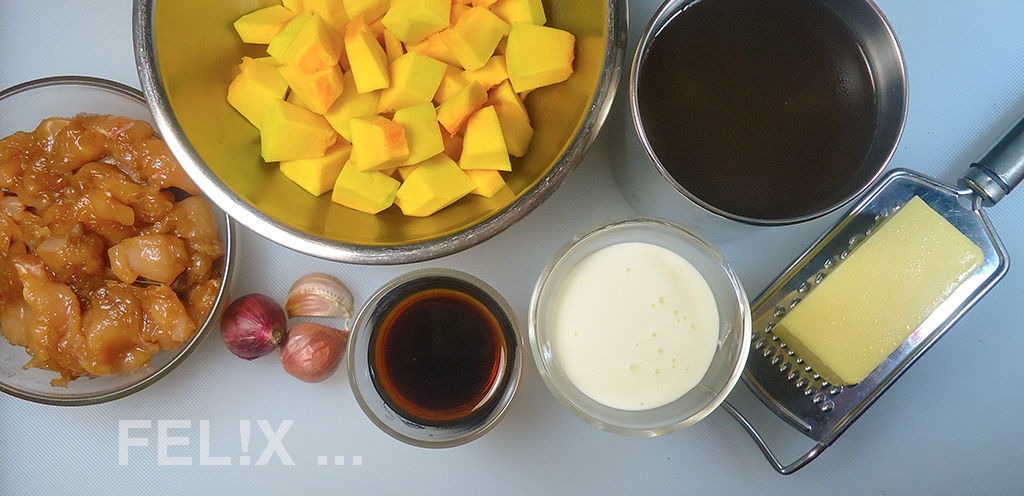 Mit Bouillon auffüllen (Kürbiswürfel nur knapp bedecken).