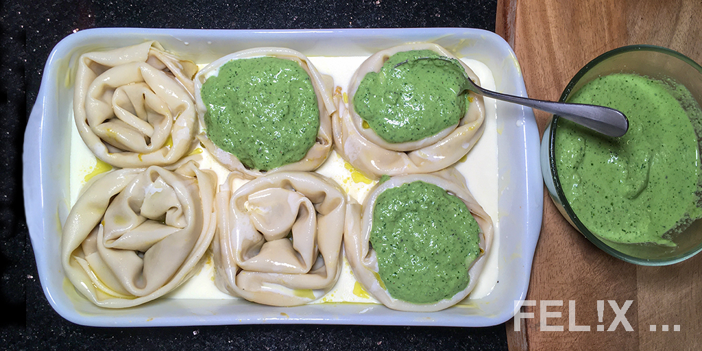 Die Cashew-Petersilien-Sauce auf den Schnecken verteilen.