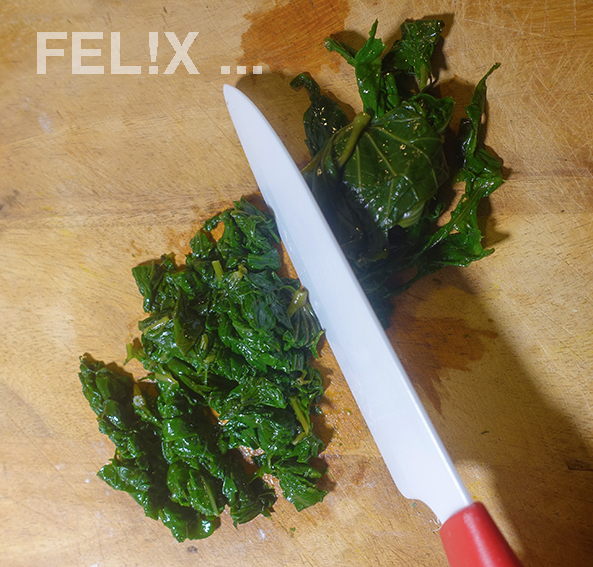 Spinat etwas ausdrücken (= ca. 120 g), grob hacken.