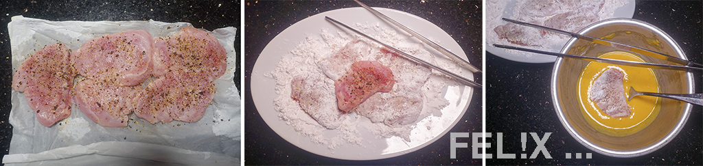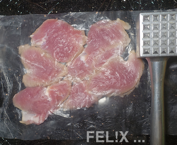 2Fleisch nach Belieben in kleinere Stücke schneiden, zwischen Klarsichtfolie leicht plattieren, es sollte nicht zu dünn werden (Fleischklopfer oder Pfannenboden).