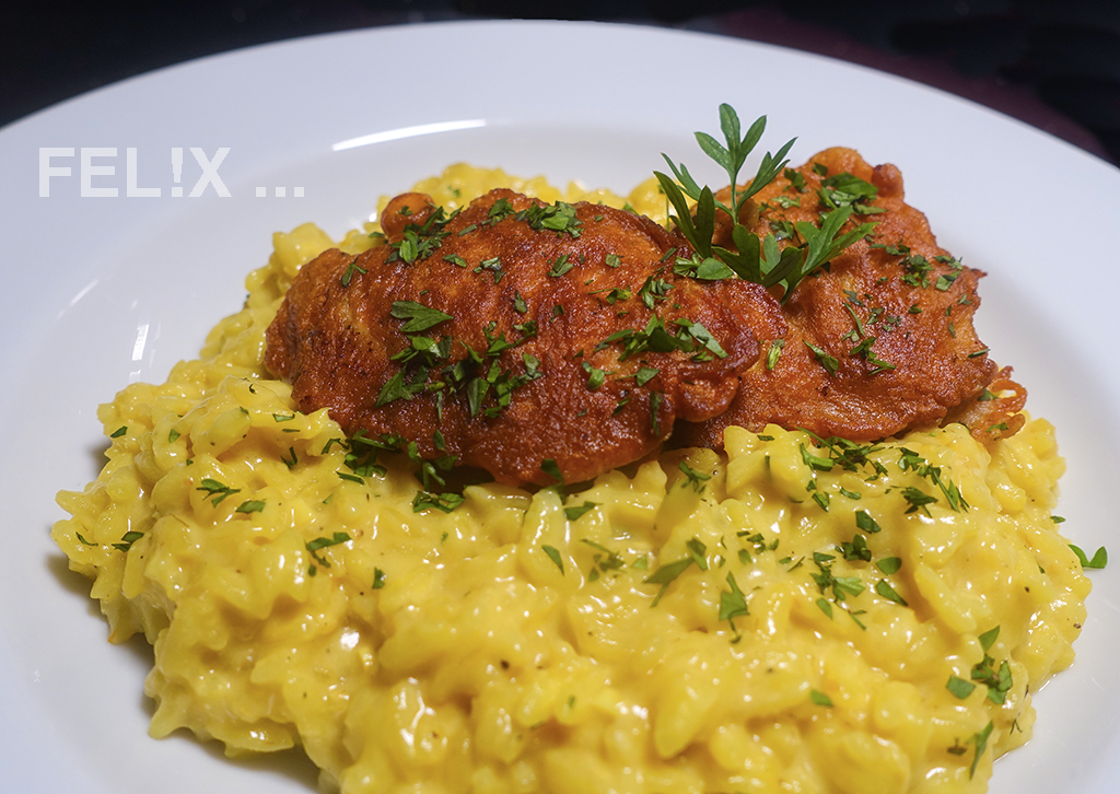 5Währenddessen einen Safran-Risotto zubereiten, siehe hier.