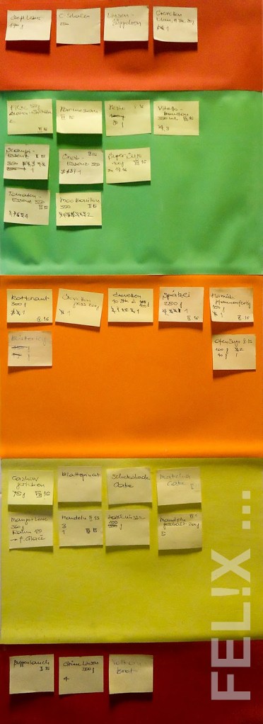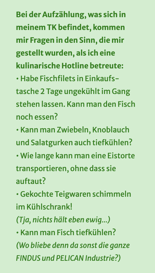 So viel wie möglich kommen von den Sachen, die unbedingt gefroren bleiben müssen, in die TK-Schublade meines Kühlschranks in der Küche, in welcher es jedoch nicht genügend Platz für alles gibt.