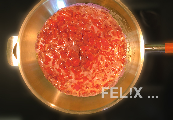Schliesslich koche ich aus der aufgetauten Beerenmischung und einem Rest ebenfalls TK-Aprikosen eine Konfitüre: hat nicht wirklich Spass gemacht bei einer Küchentemperatur von 34 Grad die brodelnde Masse zu rühren…