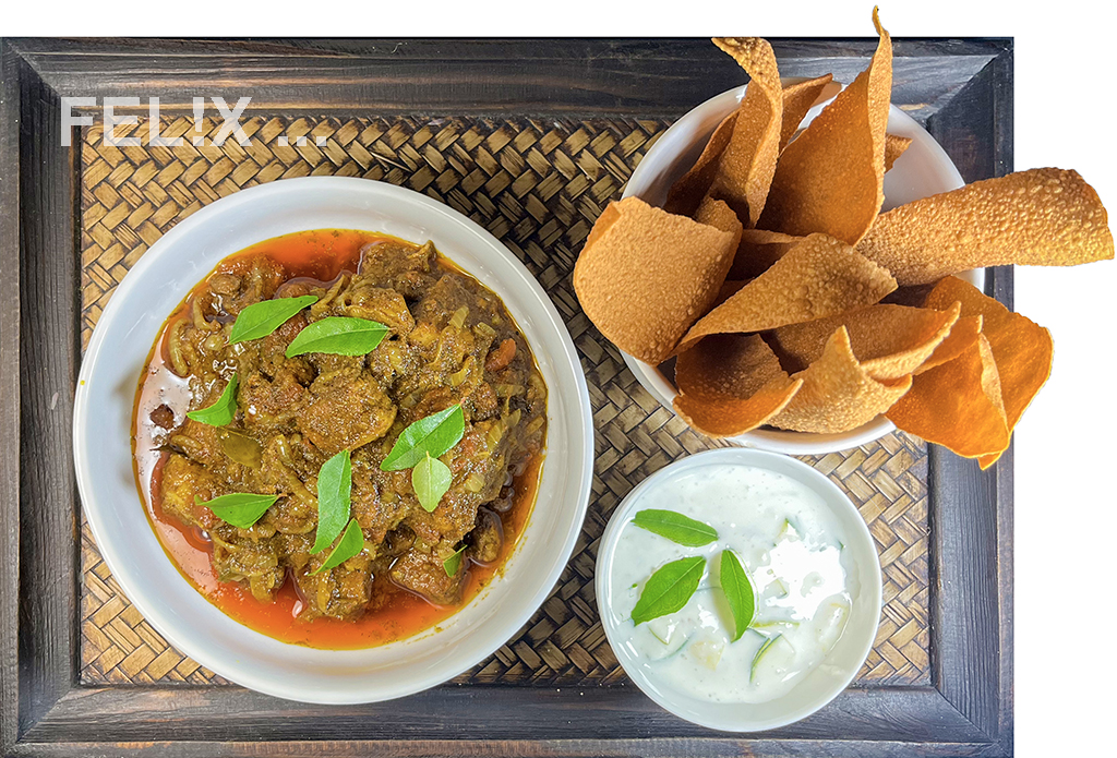 *Pappadums sind aus Linsenmehl hergestellte, getrocknete, flache Fladen aus dem Asien-Geschäft. Sie werden in Streifen gebrochen und in Öl frittiert. So vergrössern sie sich auf das Doppelte. Sie sind unverzichtbarer Bestandteil einer indischen Curry-Mahlzeit.