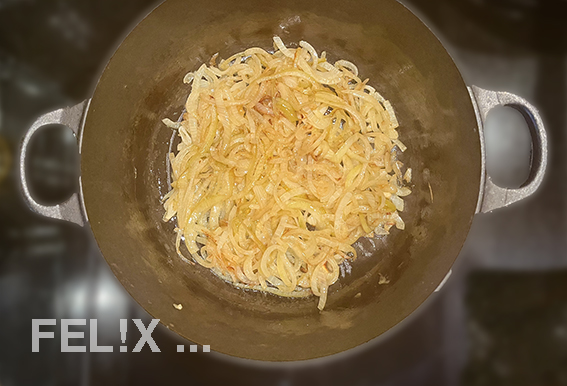 Zwiebeln in Lamellen schneiden, in einem Schmortopf in 1 EL Ghee sanft und unter fleissigem Wenden zu goldgelber Farbe anziehen.