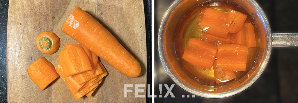Wasser mit Salz und Flüssigrauch aufkochen, Karottenscheiben darin nicht ganz zugedeckt 10–12 Minuten sanft köcheln lassen, bis die Scheiben wirklich sehr weich sind.