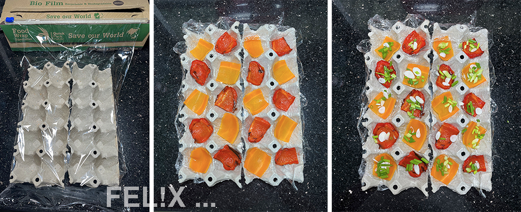Die Hälfte der Vertiefungen mit Peperonistücken, die andere mit Karottenscheibchen belegen.