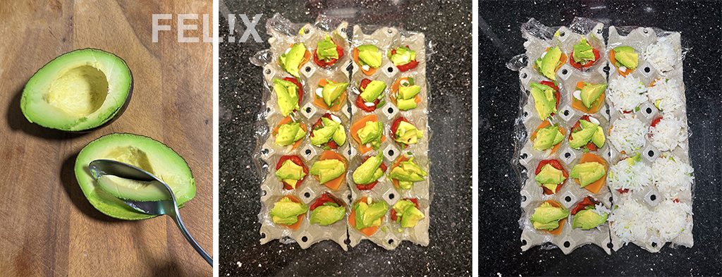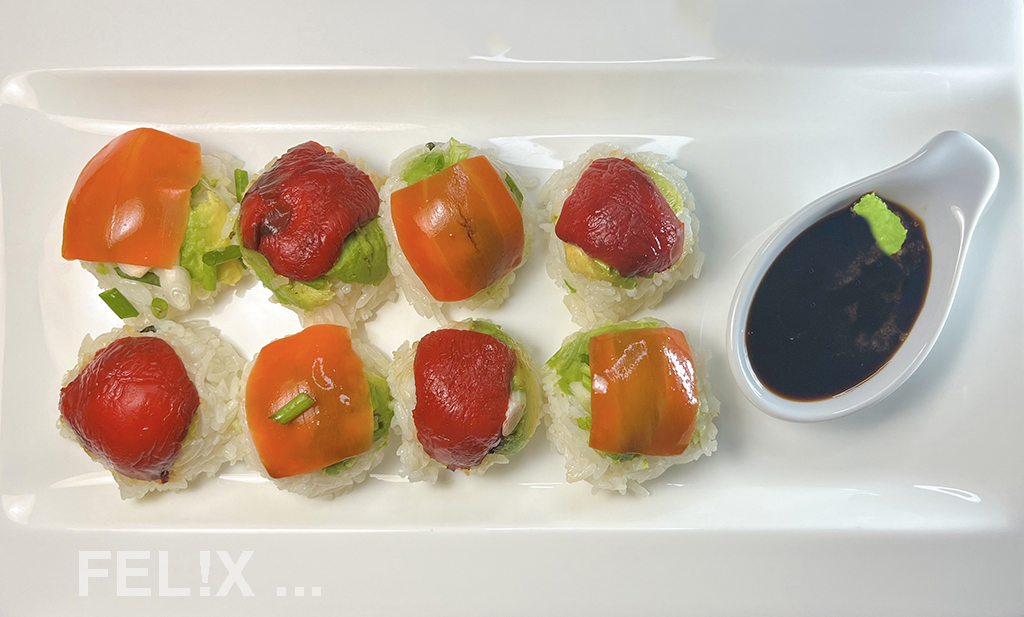 Und für einmal kommen diese «fake Sushi» auch ganz vegan daher: anstelle von Fisch oder Garnelen sind sie mit Gemüsepaprika und Karottenscheibchen belegt!