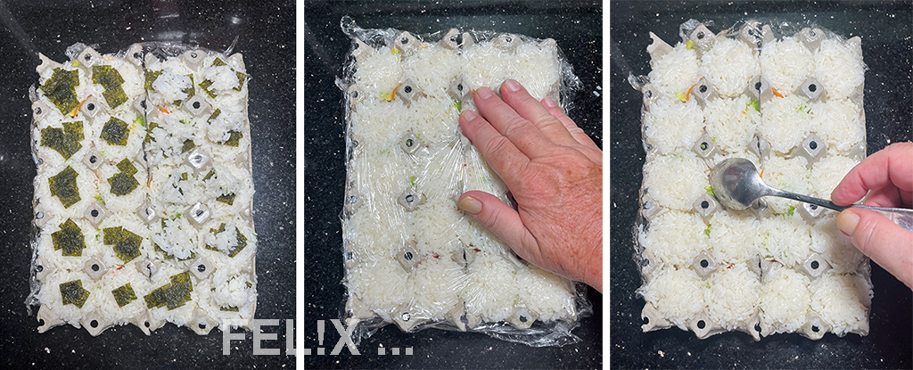 Folie entfernen, mit einem Löffel den Reis der einzelnen Sushi leicht voneinander trennen.
