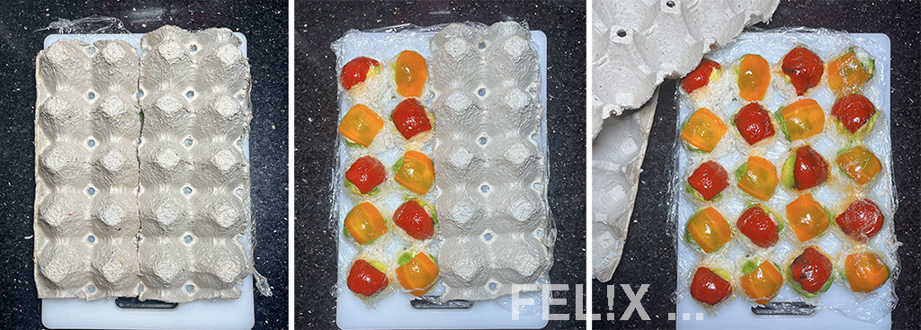 - Wer Eierschachteln aus Plastik verwendet, muss diese mit etwas Öl bepinseln, sonst lässt sich die Klarsichtfolie schlecht in die Vertiefungen drücken!