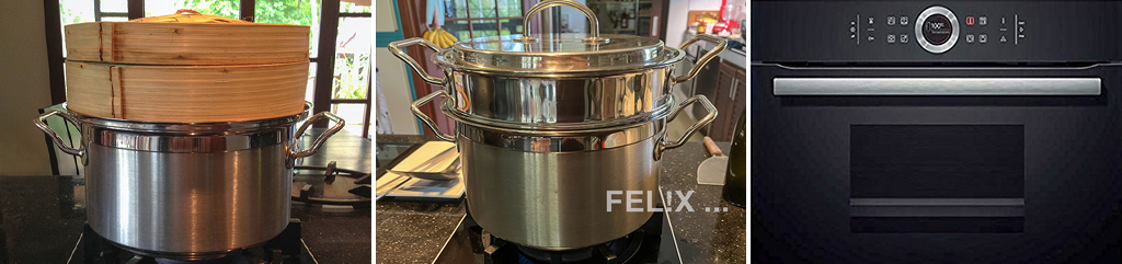• Pfanne mit Dämpfeinsatz und Deckel, oder Bambuskorb, Dampfgarer oder Combi-Steamer