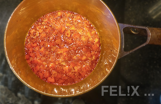 Tomatenwürfel samt den Gewürzen und Wasser beigeben, zugedeckt dünsten, bis die Tomaten zerfallen und nur noch wenig Flüssigkeit vorhanden ist.