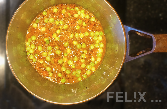 Erbsen beigeben, mit Salz und Pfeffer würzen.