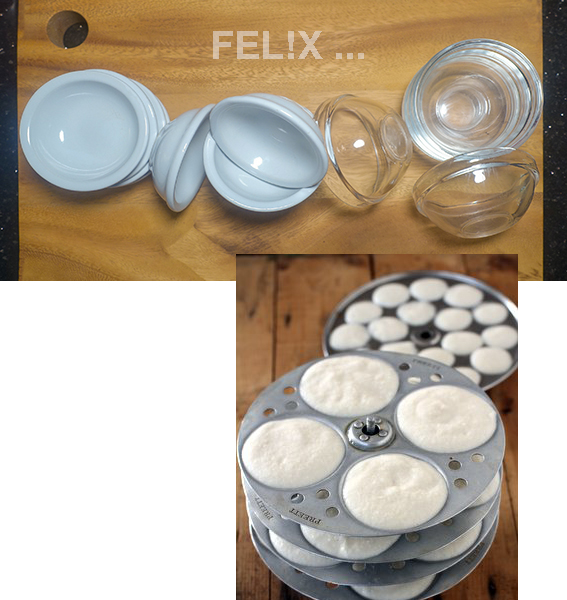 • es gibt natürlich auch diese Idli-Moulds, die übereinander gestapelt in eine grosse Pfanne mit etwas Wasser passen. Diese machen dann Sinn, wenn mehrmals wöchentlich Idli zum Frühstück gedämpft werden!