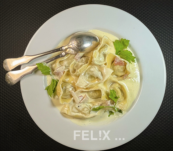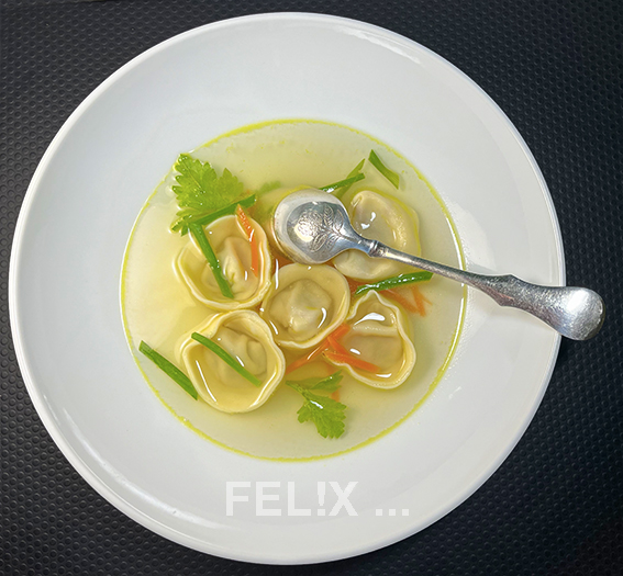 Cappelletti in reichlich Salzwasser knapp unter dem Kochpunkt 6–8 Minuten ziehenlassen (braucht wegen dem doppeltgenommenen Teigrand etwas länger, als frische Nudeln!).