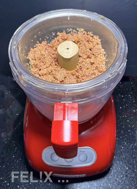 Abgekühlte Masse im Cutter möglichst fein hacken, falls nötig wenig Olivenöl beifügen.