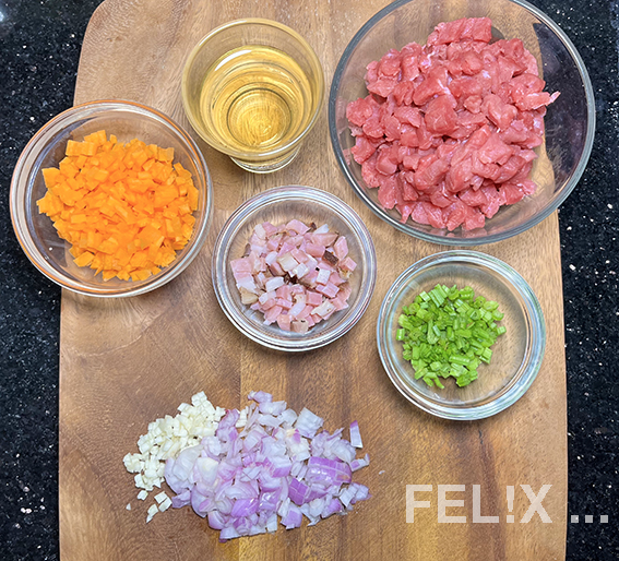 Rohschinken kurz anfrieren lassen, dann ebenfalls klein würfeln.