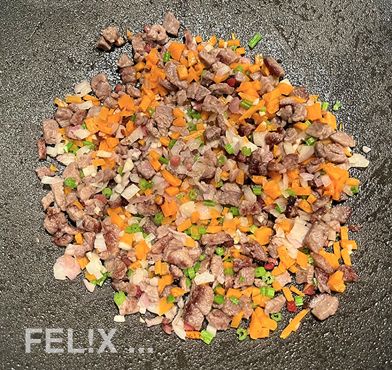 Rindfleisch klein würfeln (= mehr Röstaromen, als mit Hackfleisch!).