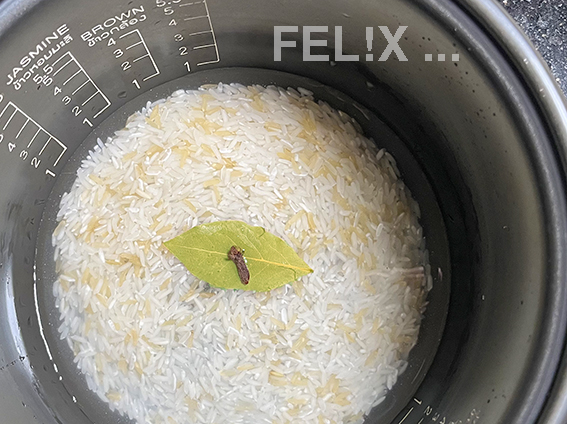 Wer keinen Reiskocher hat, dämpft den Reis mit den erwähnten Zutaten und Mengen nach der Methode, als es noch keinen Reiskocher gab, oder bereitet einen Trockenreis mit 250 g Reis, 550 ml Wasser und den erwähnten Gewürzen in einer Pfanne zu.