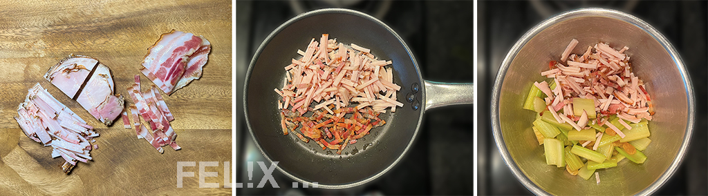 Hitzequelle ausschalten, Schinkenstreifen dazugeben.
