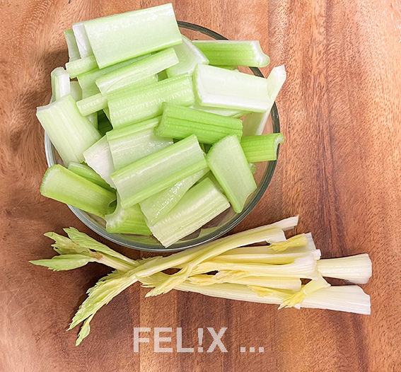 Konsistenz der Selleriestücke mit einem spitzen Messer prüfen, sie sollen knackig bleiben.