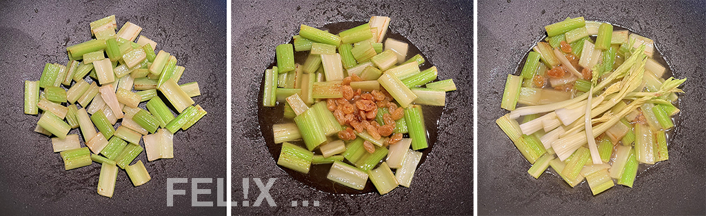 Selleriestücke leicht salzen, in der Butter unter gelegentlichem Wenden sanft dünsten, bis die ersten Stücke leicht Farbe annehmen.