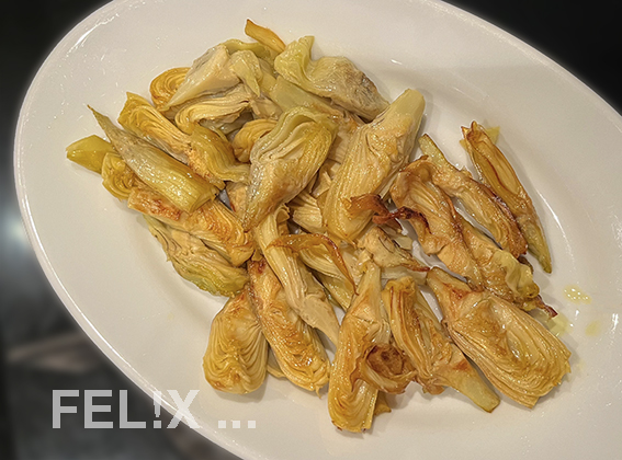 Artischocken gut abtropfen, vorsichtig vierteln damit sie nicht auseinanderfallen.