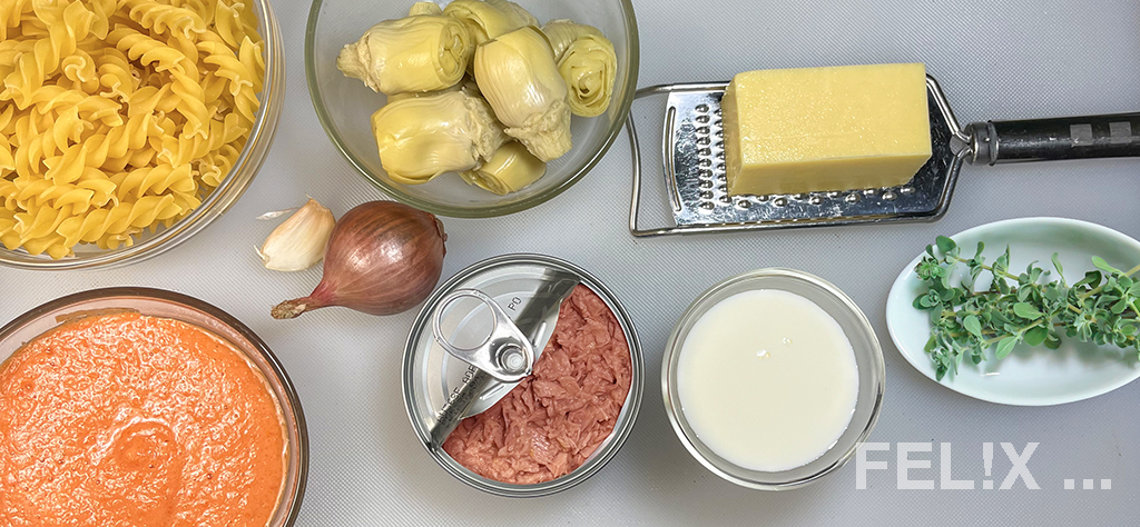 Auf der Suche nach einem Rezept für einen Pasta-Gratin mit Thunfisch bin ich neben vielen anderen Anregungen auf jene mit zusätzlicher Verwendung von Artischockenherzen gestossen. Allerdings auch mit einem Beutel «Basis für überbackenen Hörnchen-Auflauf».