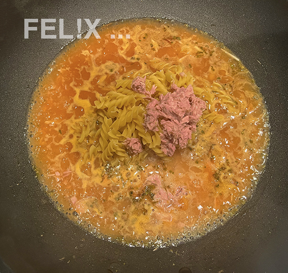 Mit dem zerpflückten Thunfisch (samt dessen Flüssigkeit) und der (ungekochten!) Pasta zu Zwiebel-Knoblauch geben.