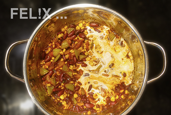 Daneben spielen Rote Bohnen, goldgelbe Maiskörner, knackiger Stangensellerie, Tomaten, Peperoni und Gewürze mit, und – als überraschende Zutat – Kokosnuss!