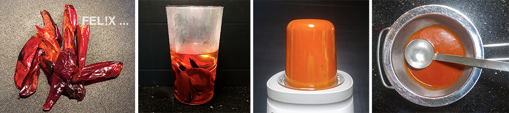 - die Schale der getrockneten Chilis ist ledrig und sehr zäh, selbst mit einem Hochleistungsmixer bleiben davon Rückstände. Deshalb die Sauce durch ein Sieb streichen!