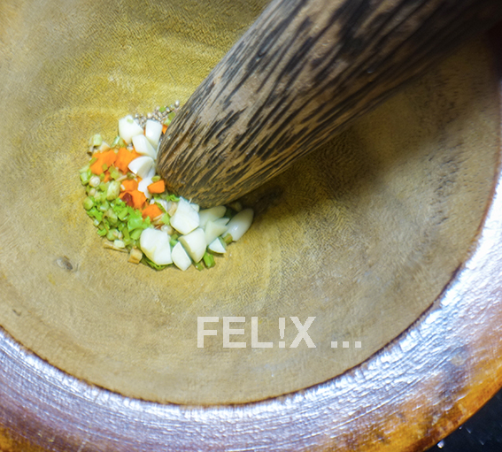 Zuerst die Pfefferkörner im Mörser zerstossen, dann die weiteren festen, grob zerkleinerten Zutaten.