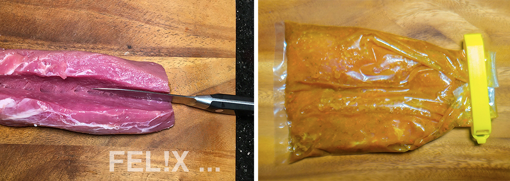 Dafür habe ich ein Schweinsfilet verwendet. Dieses wird längs tief eingeschnitten, so dass möglichst viel Oberfläche zum Aufnehmen der Aromen entsteht.