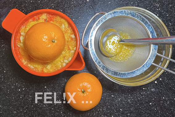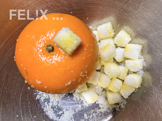 Den Orangen sieht man diese «Abreibung» praktisch nicht an, den Zucker-Würfeln hingegen schon: sie nehmen so das überaus aromatische ätherische Öl der Schale auf!