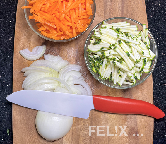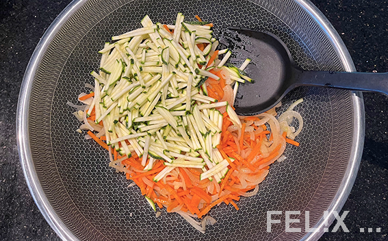 Karotten und Zucchini in dünne Stifte hobeln oder schneiden.
