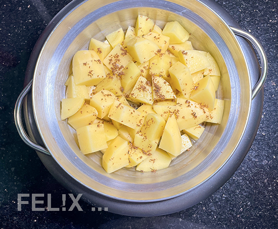 Kartoffeln schälen, grob würfeln, würzen und im Dampf ca. 25 Minuten gut weich garen.