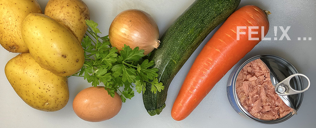 Vielleicht auch alles aus dem Vorrat? Kartoffeln vom Keller, eine Karotte, Zwiebeln und weiteres aus dem Gemüsefach, die Dose mit Thunfisch aus fangfreundlicher Fischerei!