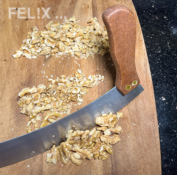 Nüsse grob hacken: ich mache das mit dem Wiegemesser.