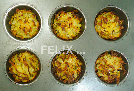 Ich habe dazu Rösti-Taler serviert: in der Muffins-Form im Ofen gebacken.