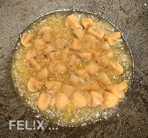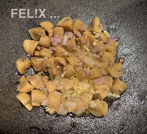 3Die Pilze, Schalotte und Knoblauch in der verbliebenen Butter anziehen.