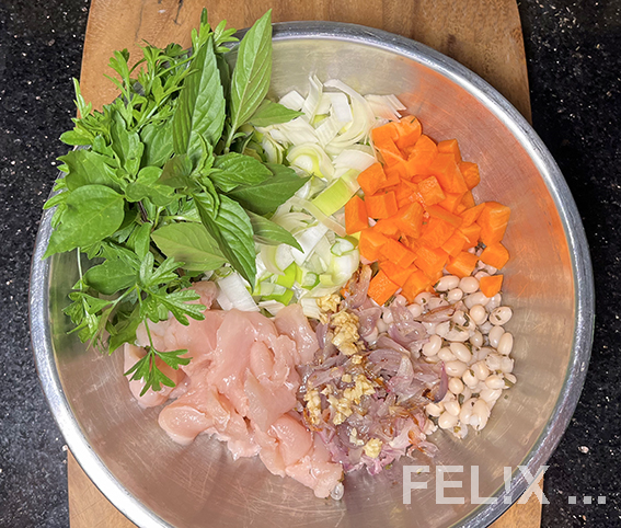 Lauch längs halbieren, quer in ca. 1/2 cm breite Stücke schneiden, Karotten 1/2 cm gross würfeln.
